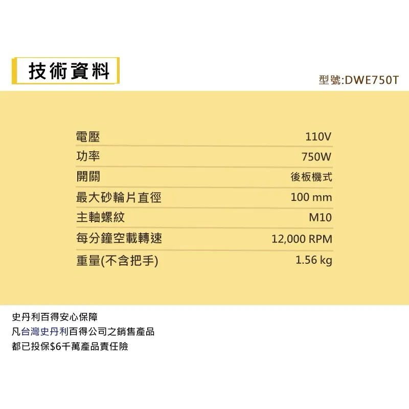DEWALT 得偉 750W 4 英吋砂輪機 後扳機式(DWE750T)